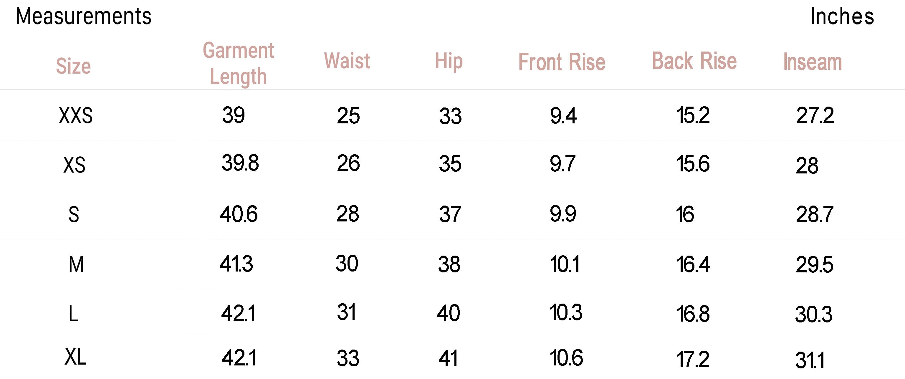 - Size XXS - Inseam: 27.2", Rise: 9.4"