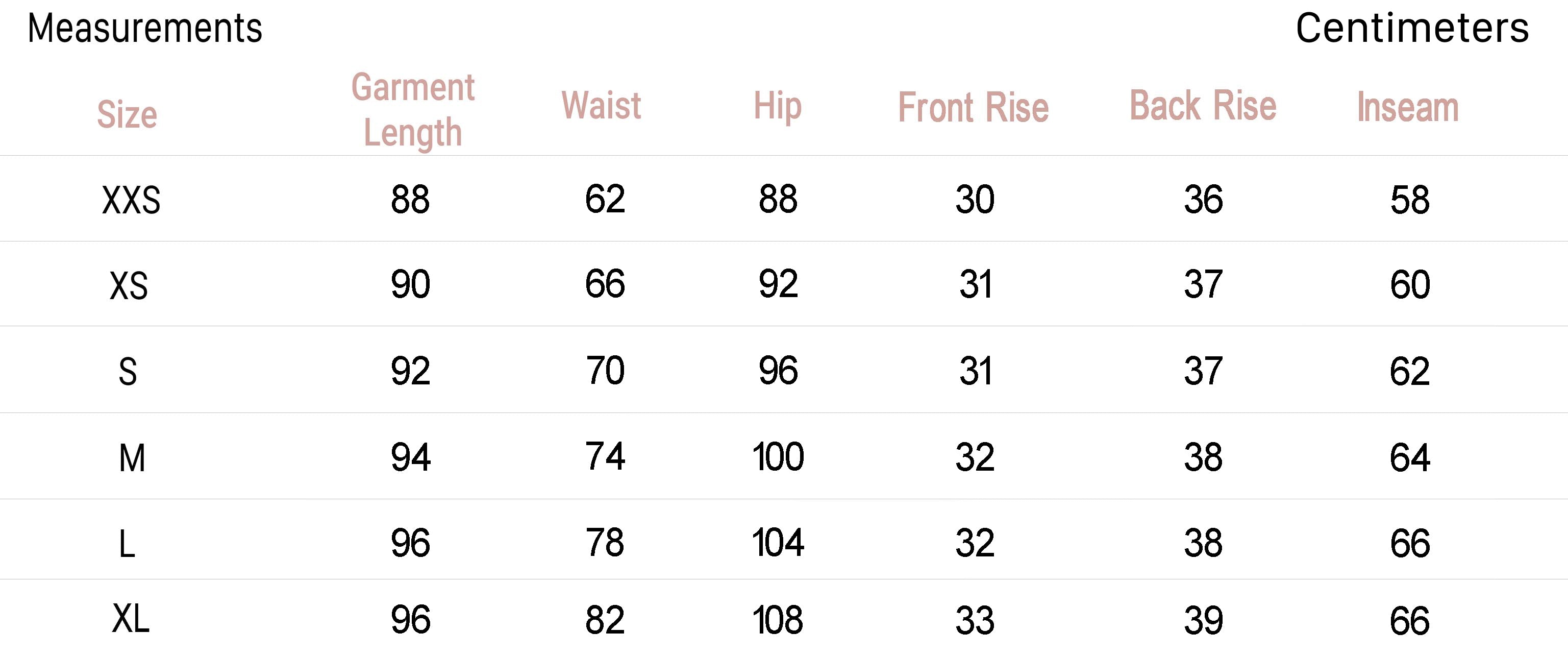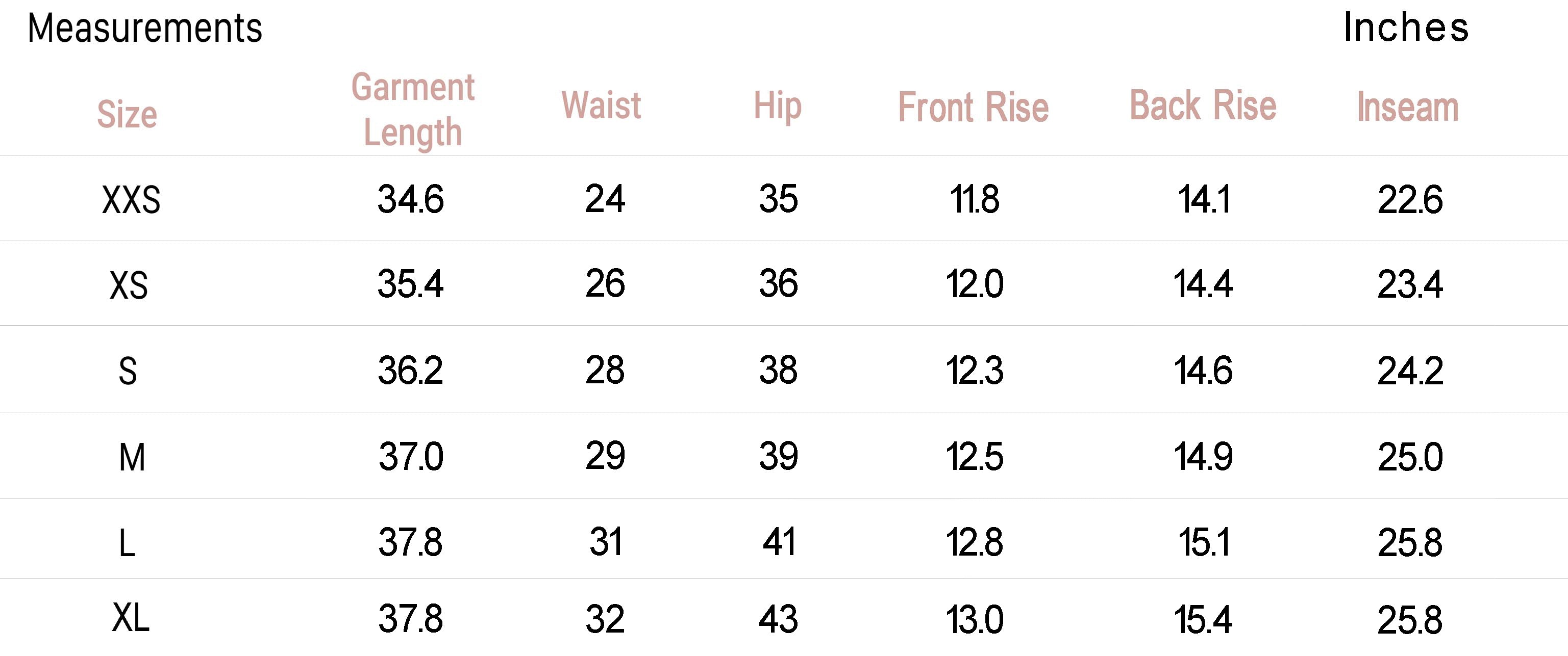 • Size XS - Inseam: 23.4", Rise: 14.4"