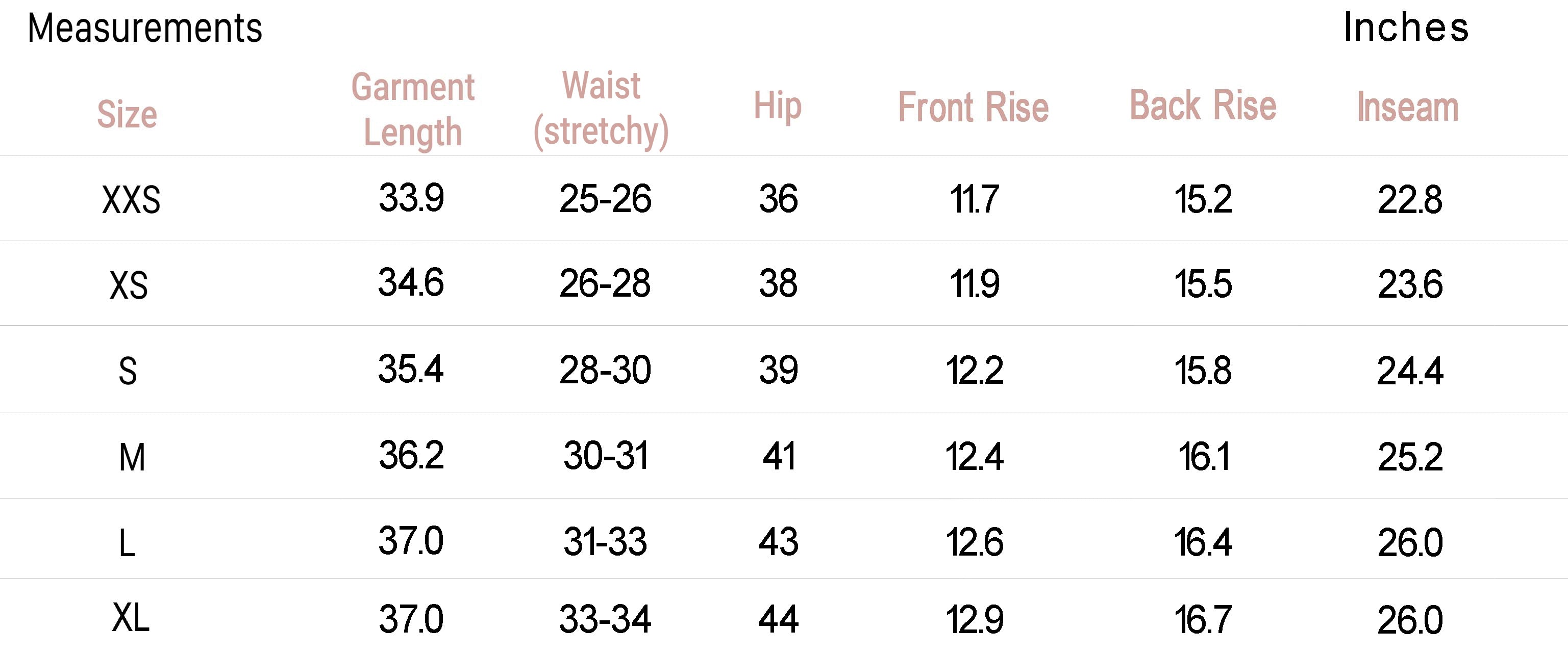 - Size XS Inseam: 23.6", Rise: 11.9"