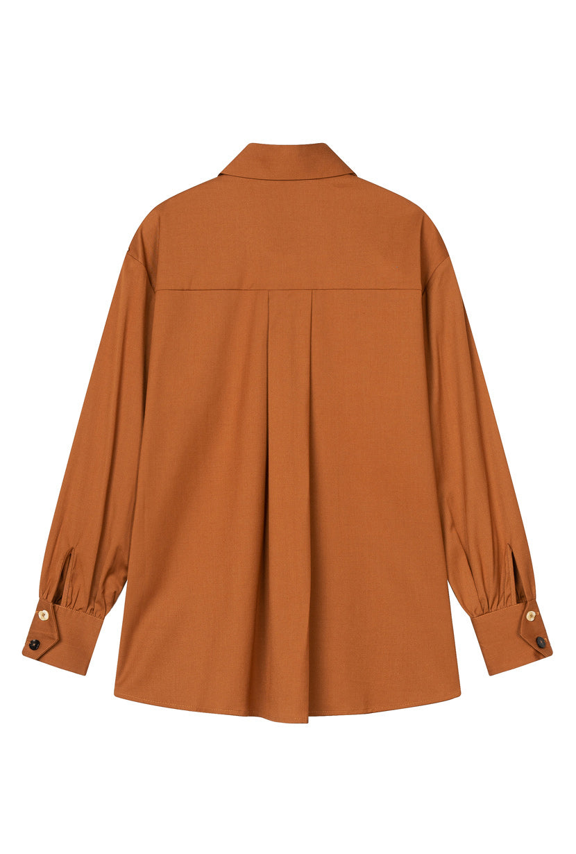 Description: A collaborative capsule collection with influencer @suggyl - The Vincent Blouse in Rust shows a captivating fusion of vintage charm and contemporary style. It’s cut oversized with slightly puffed sleeves, structured collar, and back pleats for subtle definition. Leave a few colorful buttons undone for a relaxed look.