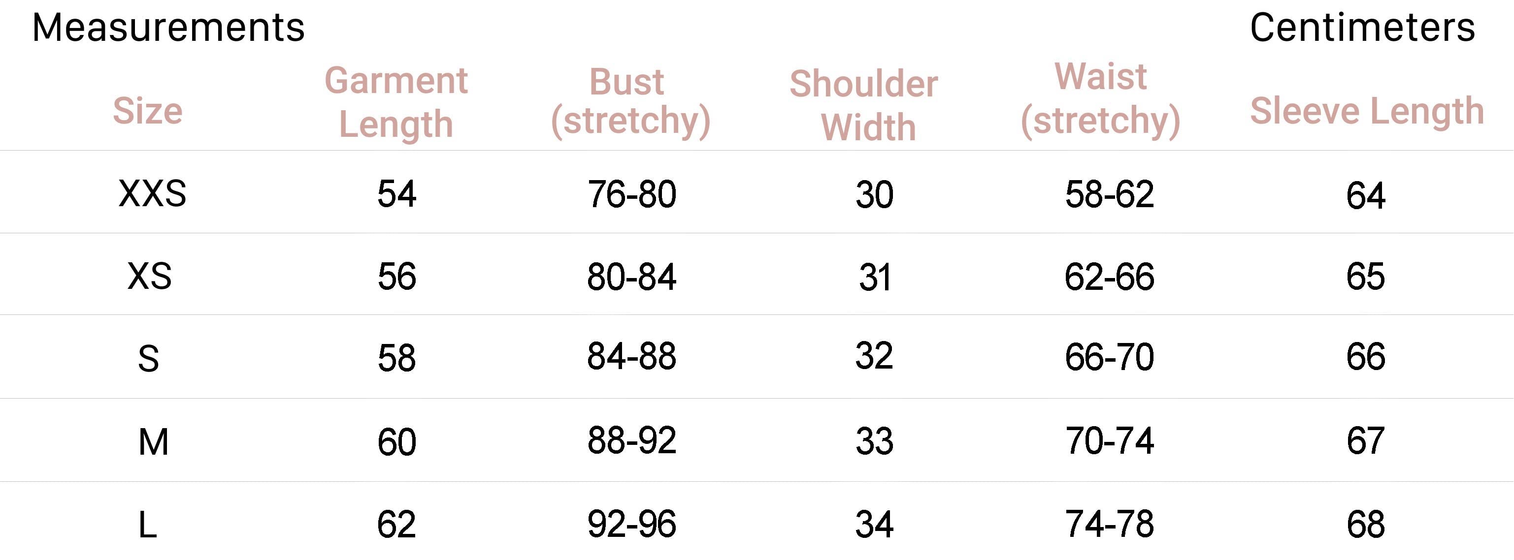| XXS | 0 | 32 | 4 | 29.5-31 | 22-24 | 32.5-34 |